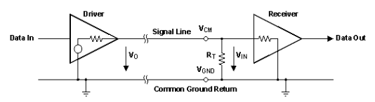 Single-ended data transmission uses only one signal line, whose potential is considered ground. While the signal line provides a positive path for the signal current, the ground line provides a return path. Figure 1 shows the basic schematic of a single-ended transmission path.