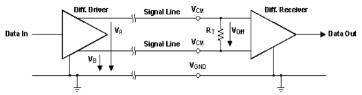 Differential signal transmission uses a signal pair consisting of two conductors: one for forward current and the other for return current. Each signal conductor has a common-mode voltage VCM, which is superimposed by 50% of the differential driver output VOD, but with opposite polarities (see Figure 2).